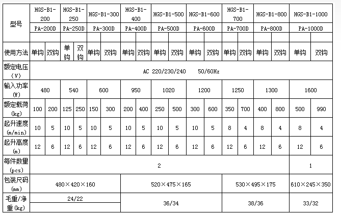 PA400D微型電動葫蘆技術參數表: