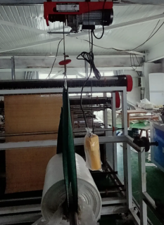 微型電動葫蘆是一種小型的重物吊裝設備,能夠滿足大卷塑料袋的承重要求,位于車床設備旁邊的工人員能夠借助電動葫蘆的遙控器控制電動葫蘆的升降和左右移動,在節(jié)省人力的情況下輕松、快速完成大卷塑料袋的轉移任務。
